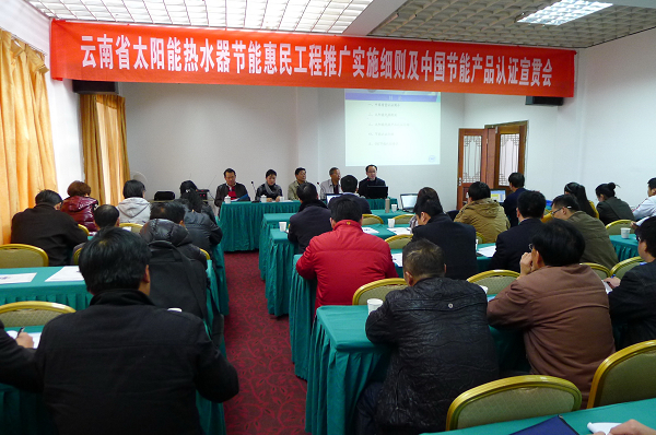 2012年12月12日,成都分中心联合云南省太阳能产业联盟、云南省产品质量监督检验研究院、云南省电子信息产品检验院在昆明市召开云南省太阳能热水器节能惠民工程推广实施细则及中国节能产品认证宣贯会,,云南省内的30多家太阳能热水器生产企业的代表参加。