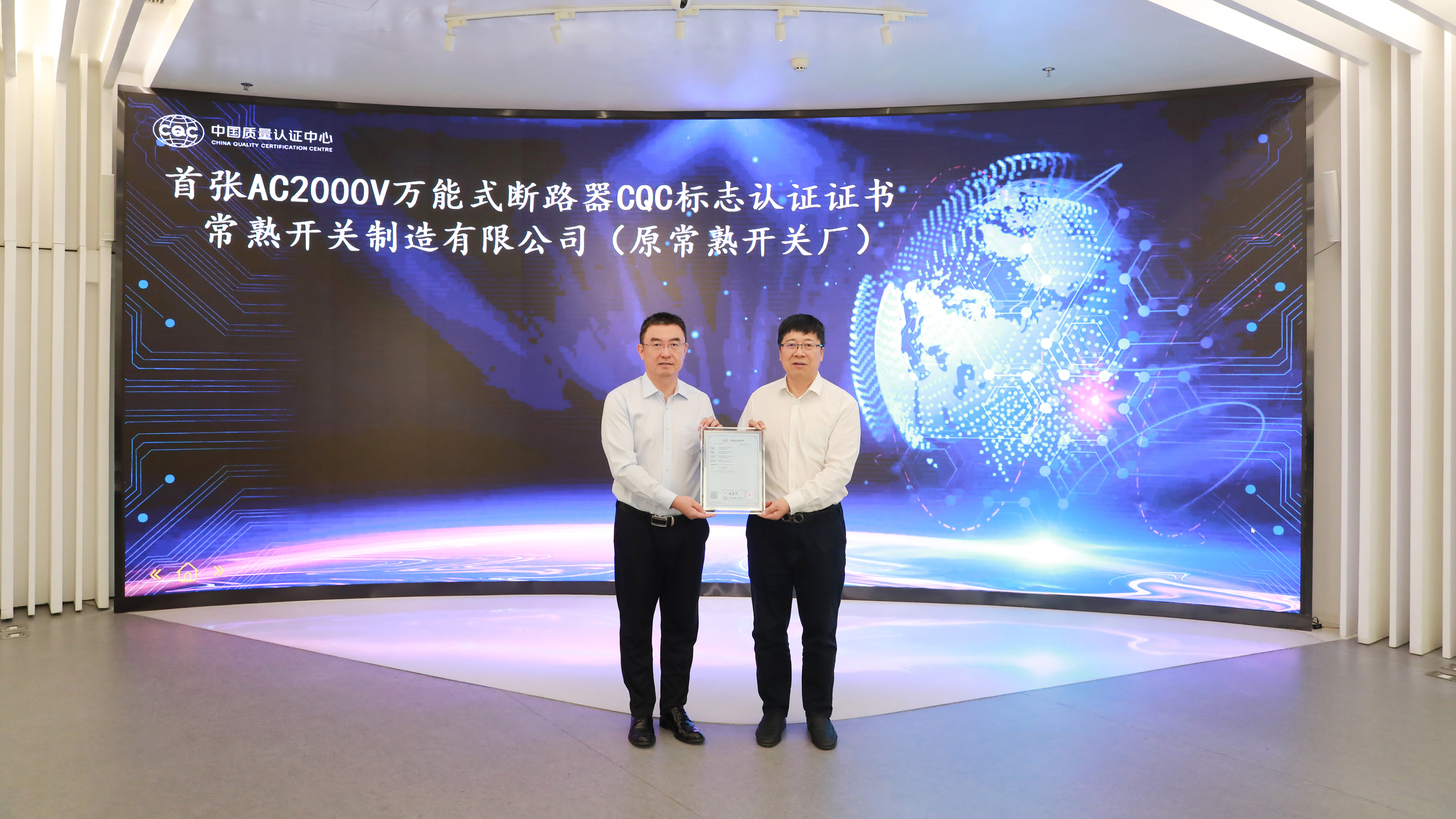 2025年9月19日,中国质量认证中心(CQC)向常熟开关制造有限公司(原常熟开关厂)颁发了首张AC2000V万能式断路器CQC标志认证证书。中国质量认证中心总经理助理郑士泉、常熟开关制造有限公司董事长兼总经理王春华及双方相关人员参加颁证仪式和座谈。