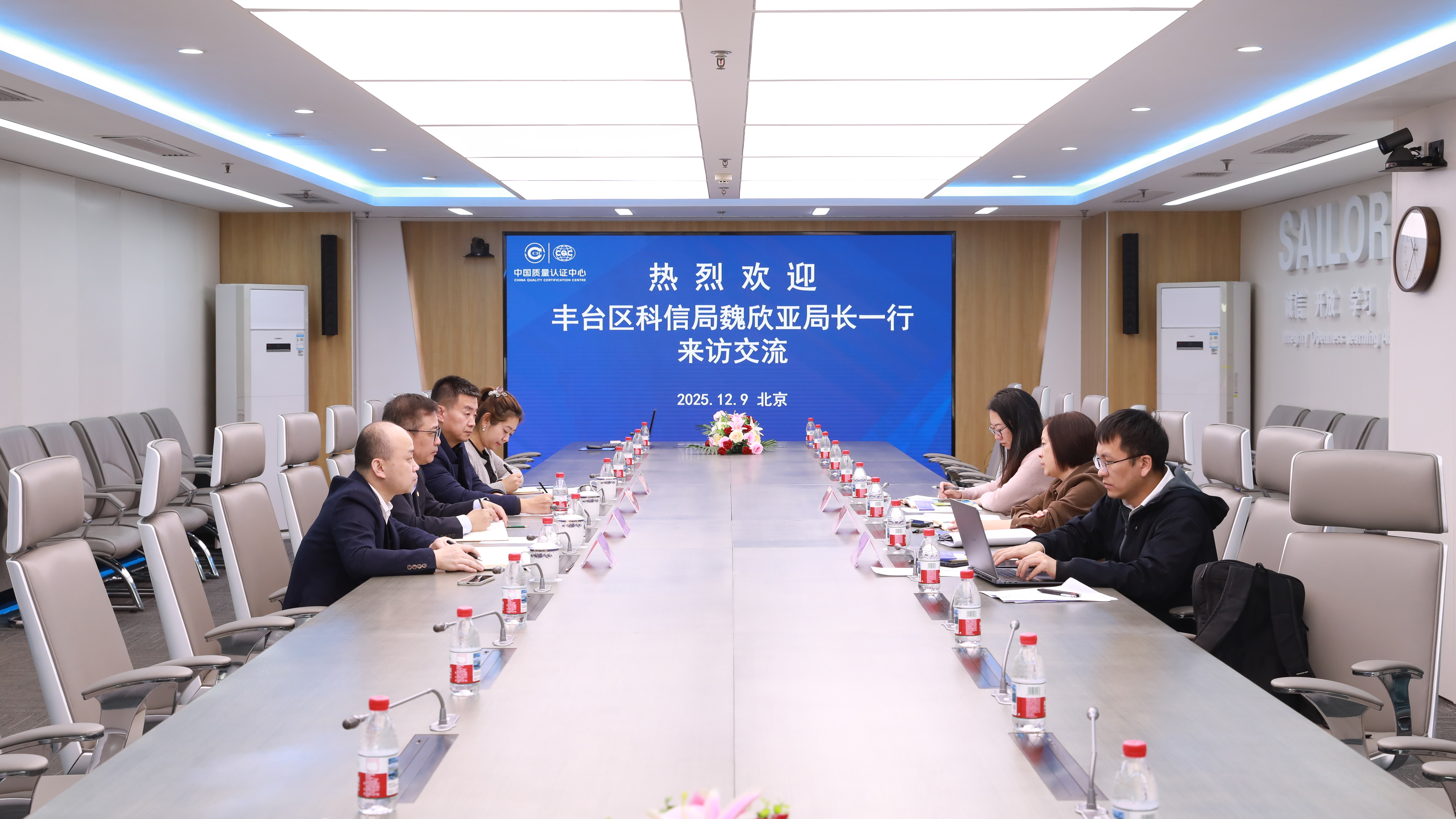 2025年12月9日,丰台区科学技术和信息化局局长魏欣亚一行到中国质量认证中心开展工作调研。中国质量认证中心党委委员、财务总监潘寒阳对一行人的到访表示欢迎,北京检查部相关负责人参加座谈。双方围绕央地合作、质量服务、绿色低碳发展等议题展开深入交流。