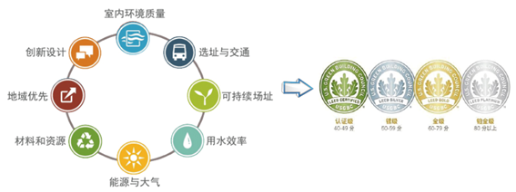 LEED( Leadership in Energy and Environmental Design),是美国绿色建筑委员会(USGBC)研发制定的绿色建筑评估体系,适用于各种类型建筑。LEED评价指标涉及选址与交通、可持续场址、用水效率、能源与大气、材料和资源、室内环境质量、创新设计、地域优先等8个方面。LEED分为铂金级、金级、银级、认证级四个评价等级。