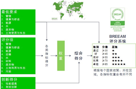 BREEAM( Building Research Establishment Environmental Assessment Method ),是英国建筑研究院(BRE)制定的建筑研究院环境评估方法,是世界上第一个绿色建筑评估体系,适用于各类型建筑。BREEAM从管理、健康和幸福、能源、运输、水、原材料、土地使用、污染等9个方面,对参评建筑的设计阶段和施工阶段进行评价和引导。BREEAM分为通过、良好、优秀、优异、杰出五个评价等级。