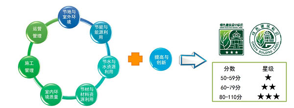 中国绿色建筑评价标识,从节地、节能、节水、节材、室内环境、施工管理和运营管理七个方面,对参评建筑设计阶段和运行阶段分别进行评价和引导。中国绿色建筑评价标识分为一星级、二星级、三星级。