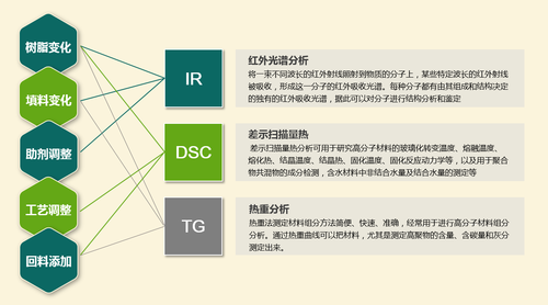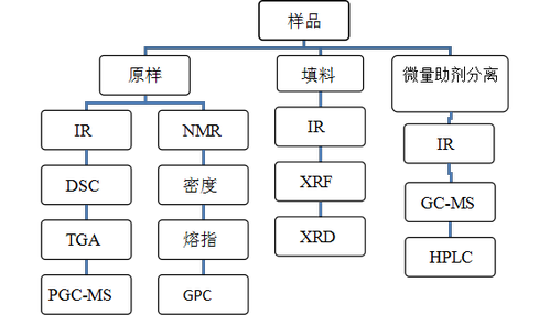针对日常性的材料质量控制,可通过常规性能测试(如熔指、灰分、机械性能)和指纹图谱(IR+DSC+TG)等手段完成。但是,考虑到高分子材料配方较为复杂,各种微量助剂的加入均可能影响材料的关键性能。因此在传统的指纹图谱控制的基础上,也可能要借助其他的检测方法对微量助剂的引入加以甄别