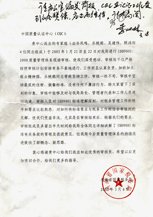 以服务取胜,以质量取胜 ??河南省国税局来函感谢CQC专家组 编者按:2003年3月6日,河南省国家税务局特地向中国质量认证中心(CQC)发来感谢信,对中心派出专家组的工作表示衷心感谢,并对他们在审核河南省国税局ISO9001:2000质量管理体系工作中一丝不苟、认真负责的精神给予了高度赞扬。 孙凤鸣、乐桃鹃、吴建伟、顾鸿翔四位同志的工作得到了河南省国税局的肯定,再次用鲜活的例证表明,CQC要发展壮大,必须要建立一支作风过硬的队伍,建立以服务客户为宗旨的良好风气,要以严谨的认证审核态度和廉洁负责的工作作风服务客户。 CQC李怀林主任在收到感谢信后表示,CQC 工作人员要以他们为榜样,进一步强化服务意识,提高服务质量,惟此才能确保认证工作优质、高效、规范、准确地推进,也才能尽早实现建立中国认证航母的宏伟目标。感谢信全文如下: 中国质量认证中心(CQC): 贵中心派出的专家组(由孙凤鸣、乐桃鹃、吴建伟、顾鸿翔4位同志组成)于2003年1月21日至22日对我局进行ISO9001:2000质量管理体系现场审核,使我们深受感动。审核组不仅严格按照审核计划安排有条不紊地进行工作而且认真负责,加班加点,敬业精神强。乐桃鹃同志带病坚持工作,审核一丝不苟。审核中坚持最低的住宿、就餐标准,没有任何不廉洁行为,给大家留下了深刻的印象。审核中能够及时与我局局长、管理者代表和工作人员进行沟通,审核人员对ISO9001标准理解深刻,对税务管理工作的程序和要求比较熟悉,对如何将标准要求与税务工作相结合有独到的见解,使我们受益非浅。尤其是在审核结束后,根据我们的要求,审核组成员多留出半天时间给我局全体同志详细讲解了ISO9001标准有关条款的要领及改进意见,为我局今后质量管理体系的持续改进提供了新概念、新思路。 衷心感谢贵中心给我们派出如此优秀的审核员,希望以后更加密切合作,给我们更多的指导。 |