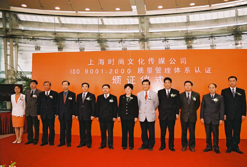 2月28日上午,文广新闻传媒集团举办了隆重的颁证仪式,在中国质量认证中心主任李怀林宣读认证结论后,国家认证认可监督管理委员会主任王凤清、中共上海市委常委宣传部长王仲伟和上海出入境检验检疫局局长杨杰明向生活时尚频道颁发了认证证书。