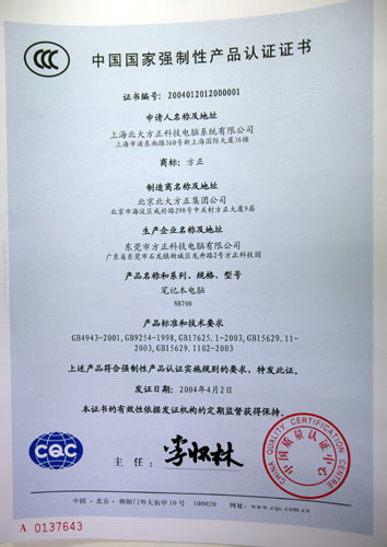 由中国质量认证中心(CQC)颁发的首张“CCC i”证书于今天诞生,这张证书是CQC颁发给北京北大方正集团公司的。