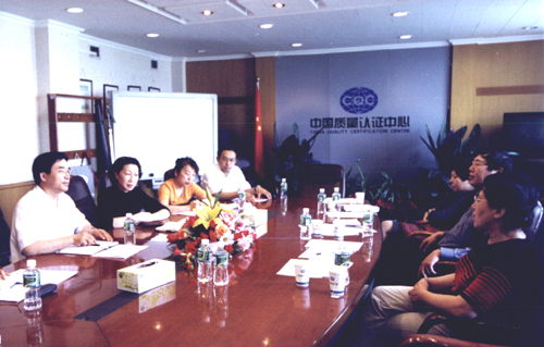 认监委刘卓慧副主任(右一)与CQC李怀林主任(左一)、车有高副主任(左二)及CQC培训处人员座谈