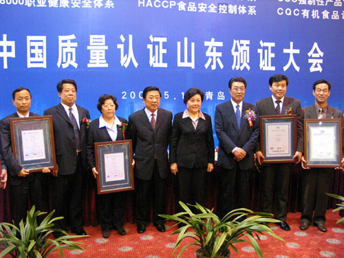 此次获证的组织有:青岛市委督查室,获得全国第一张党政机关督查督办系统ISO9000国际质量管理体系证书;青岛海尔集团有限公司,继取得全球首张CCC认证证书后,其在黑色家电领域尤其是数字高清电视领域领先的V6系列数字高清彩电又获得了CCC认证证书;泰安市泰山风景名胜区管理委员会,获得ISO9000和ISO14000国际管理体系双认证,在山东同行业中为首家;烟台张裕葡萄酿酒股份有限公司,在多年ISO9000国际质量认证管理体系认证的基础上,又获得ISO14000环境管理体系认证证书;三角轮胎集团有限公司,继取得全国第一张轮胎产品CCC认证证书后,填补国内空白替代进口的SUV系列子午线轮胎产品也获得了CCC认证证书;莱州市盐业集团,获得全国第一家CQC有机食品认证证书。