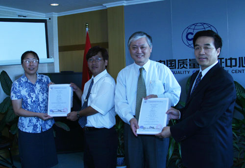 CQC李怀林主任(右)王克娇副主任(左)亲自将3C认证证书颁给台湾研华股份有限公司负责人