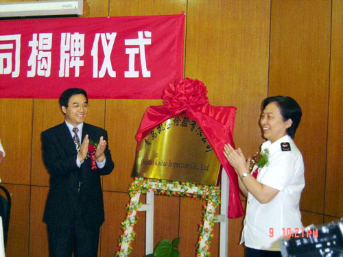 中国质量认证中心(CQC)主任李怀林(左)和山东出入境检验检疫局副局长张纳(右)一起为“青岛凯宝检验有限公司”揭牌