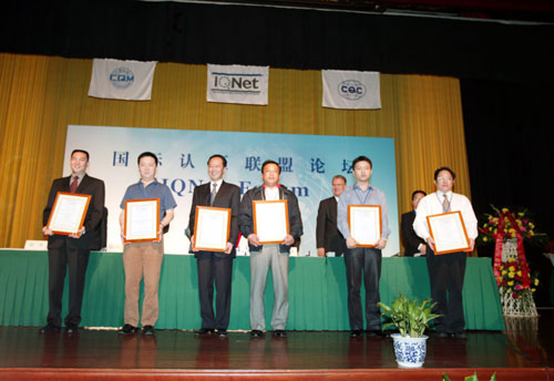 在IQNet北京论坛期间,国家认监委王凤清主任为中国国际电视总公司节目代理部(中国广播电影电视节目交易中心)等获证企业颁发CQC ISO9001体系认证证书