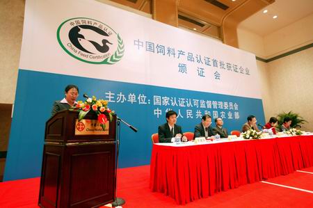 认监委程方副主任在讲话中指出,近年来,我国饲料工业生产得到飞速发展,饲料产量跃居世界第二位,仅次于美国,为进一步落实国务院关于建立“从农田到餐桌”全过程体系要求,提高饲料质量安全卫生水平、促进饲料工业和养殖业发展,国家认监委、农业部于2003年12月31日联合发布了《饲料产品认证管理办法》,建立了国家的饲料产品认证制度。这项制度的实施,有利于通过第三方认证的方式,使动物养殖企业选择安全、优质、高效的饲料,既可以保障养殖企业的利益,又可以保障动物的健康安全,进而降低企业经营风险。目前,有中国质量认证中心等六家认证机构开展了饲料产品认证工作,并取得了一定的成效。