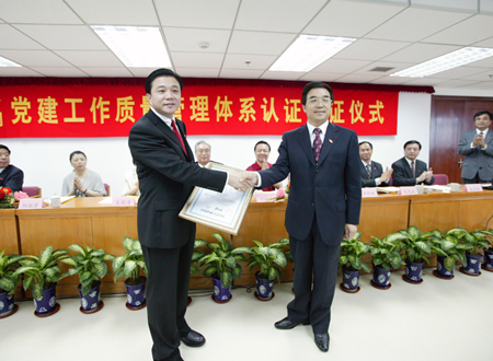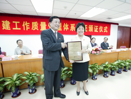 ,中国机械设备进出口总公司党建质量管理体系认证颁证会在北京举行,国家认监委王凤清主任、中国质量认证中心(CQC)李怀林主任出席大会并为企业颁发了证书和铭牌。至此,中国机械设备进出口总公司成为我国第二家通过党建质量管理体系认证的企业,同时也开创了我国外贸企业在党建工作中推行ISO9000质量管理体系认证的先河。