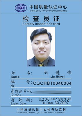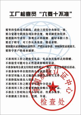 检查员证正面内容包括:姓名、编号、身份证号码、有效期限和正面免冠照片。背面内容为《中国质量认证中心工作人员守则》(即“六要十不准”)和CQC检查处印章。