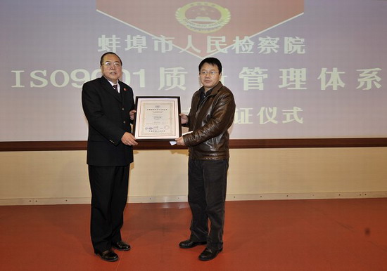 2009年12月22日,在蚌埠市人民检察院ISO9001质量管理体系认证颁证仪式上,中国质量认证中心(英文缩写CQC)副主任吴玉平向该院颁证,并代表CQC对该院通过质量管理体系认证表示祝贺并提出持续改进的希望。