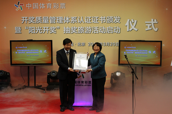 2012年3月20日,国家体育总局体育彩票管理中心质量管理体系认证证书授予仪式在京举行。中心主任王克娇应邀参加。