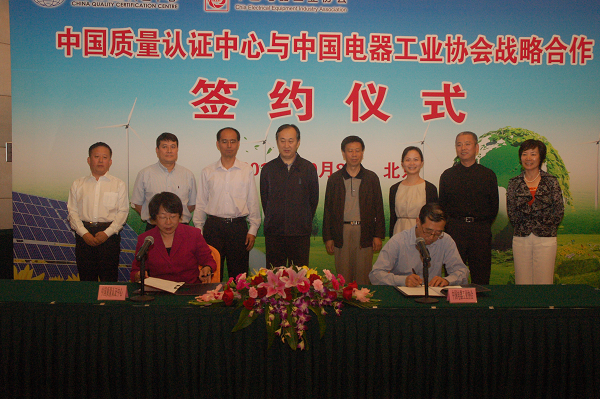 2012年10月8日,中国质量认证中心与中国电器工业协会战略合作协议签字仪式在北京“中国职工之家”隆重举行。中心主任王克娇出席仪式,国家能源局能源节约和科技装备司、国家发改委气候司、国家认证认可监督管理委员会认证监管部、国家标准化管理委员会等部门的领导,和来自我国国家级新能源检测中心、国内风力发电、光伏发电、新能源汽车等新能源龙头生产企业的代表共计30余人参加签字仪式。