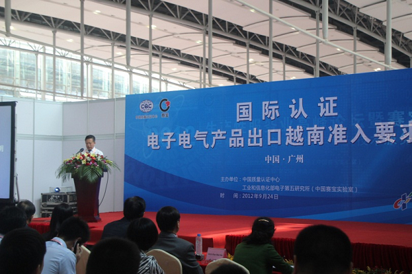 2012年9月24日,中心联合中国赛宝实验室举办国际认证-电子电器产品出口越南准入要求说明会。中心副主任陈伟出席会议,广东省中小企业局副局长何左贤、工信部电子五所副所长陈立辉及越南QUATEST3副总裁Mr. Hoang Lam参加会议。会议就越南电子电器的准入制度要求做了详细介绍。(国际业务部 供稿)