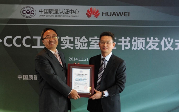 2014年11月21日,华为技术有限公司可靠性实验室获得中国质量认证中心(CQC)授权的CCC工厂实验室资格,成为业内首家具备该项资质的企业实验室。中国质量认证中心副主任刘彦宾和华为公司2012实验室质量部部长辛小红共同出席了CCC工厂实验室证书授予仪式。