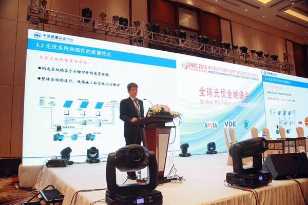 CQC应邀出席SNEC主题论坛“全球光伏金融峰会”,中心副主任宋向东在会上发表题为“光伏部件及系统的可靠性质量保障”的演讲,围绕光伏系统和部件的质量特点、质量保证方法、国家政策、质量评价服务模式创新等方面与参会代表进行分享。同时,宋向东作为论坛嘉宾与国内外光伏行业专家就“质量是支撑光伏产业下一阶段增长的关键因素”议题进行探讨。