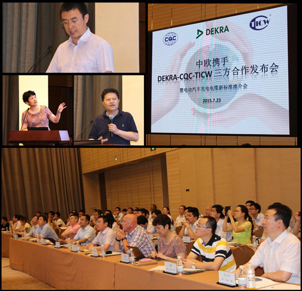 2015年7月23日,中国质量认证中心(CQC)、德凯质量认证(上海)有限公司(DEKRA)和国家电线电缆质量监督检验中心(TICW)在上海召开了DEKRA-CQC-TICW三方合作发布会暨电动汽车充电电缆新标准推介会,会上报告了自今年4月签约以来,三方合作工作组在电动汽车充电传导系统用电缆产品方面的标准研究进展及联合认证业务。会议邀请了电动汽车充电电缆的用户、行业专家及电缆制造企业,就新标准进行了热烈的讨论和交流。 (产品认证四部 供稿)