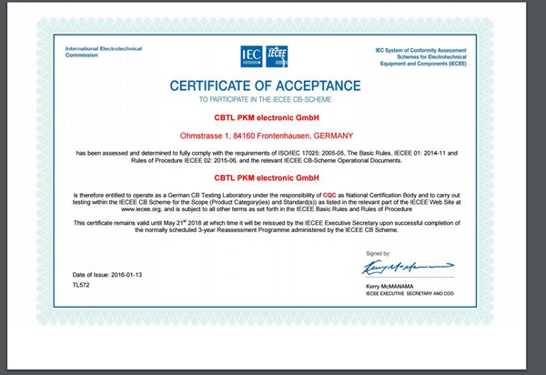 2016年1月,德国PKM electronic GmbH (以下简称PKM)实验室通过CQC加入IECEE体系,成功获得CBTL资质,成为中心首家海外CB实验室。