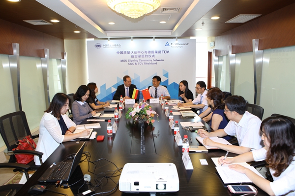 2016年8月23日,中国质量认证中心与TÜV莱茵检测认证服务(中国)有限公司在京签署培训合作备忘录。中心副主任程秀芹、TÜV莱茵总部莱茵学院执行副总裁Markus Dohm先生以及双方代表10余人参加了签约仪式。