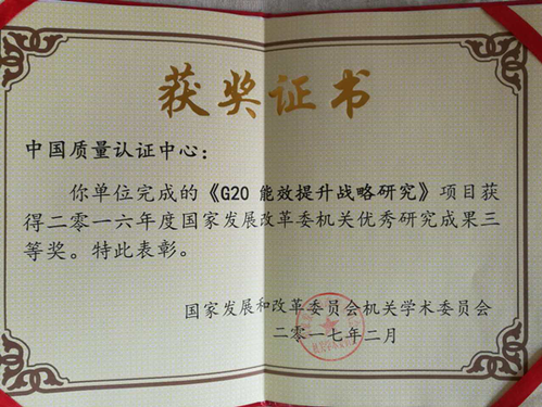 日前,中心完成的《G20能效提升战略研究》项目获2016年度国家发展和改革委员会(简称“国家发改委”)机关优秀研究成果三等奖。