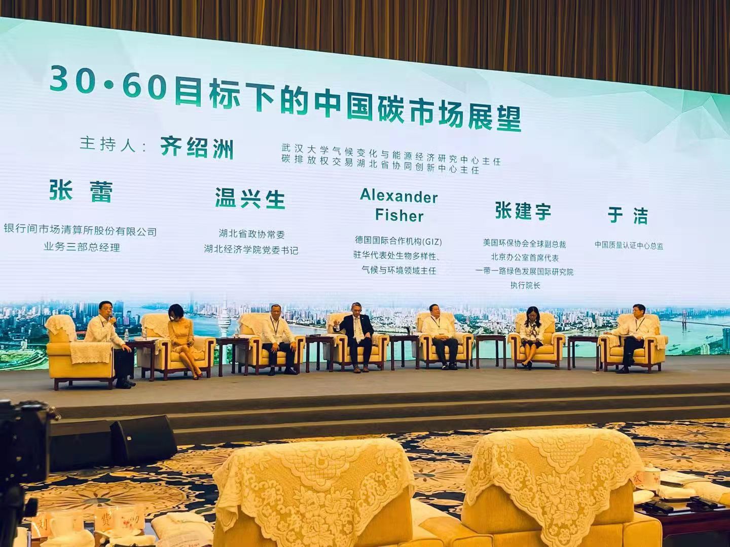 中心副主任曾广峰率队参加湖北分会场的启动仪式,见证了全国碳排放权交易市场正式鸣锣开市。中心产品认证六部负责人在当天举办的首届30·60国际会议的圆桌会议上就30·60目标下的中国碳市场展望进行了主旨发言,向与会代表介绍了中心开展的低碳研究及参与的国内碳市场工作情况、湖北试点交易对全国碳市场的积极作用和可参考借鉴的亮点工作,并强调碳交易是运用市场化手段,激发企业低碳绿色转型发展和助力我国“碳达峰、碳中和”目标实现的有效措施之一。