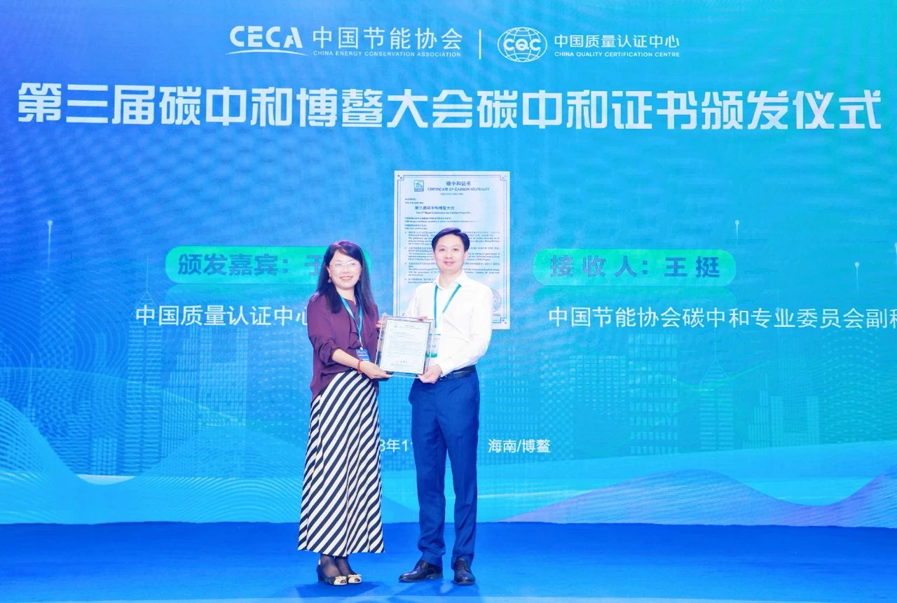 活动现场,认证中心还为此次大会颁发了碳中和证书。经认证中心核算,此次大会共产生73吨二氧化碳当量碳排放,主办方在自主节能减排的基础上通过注销等量减排量抵消剩余排放的方式实现了大会碳中和。