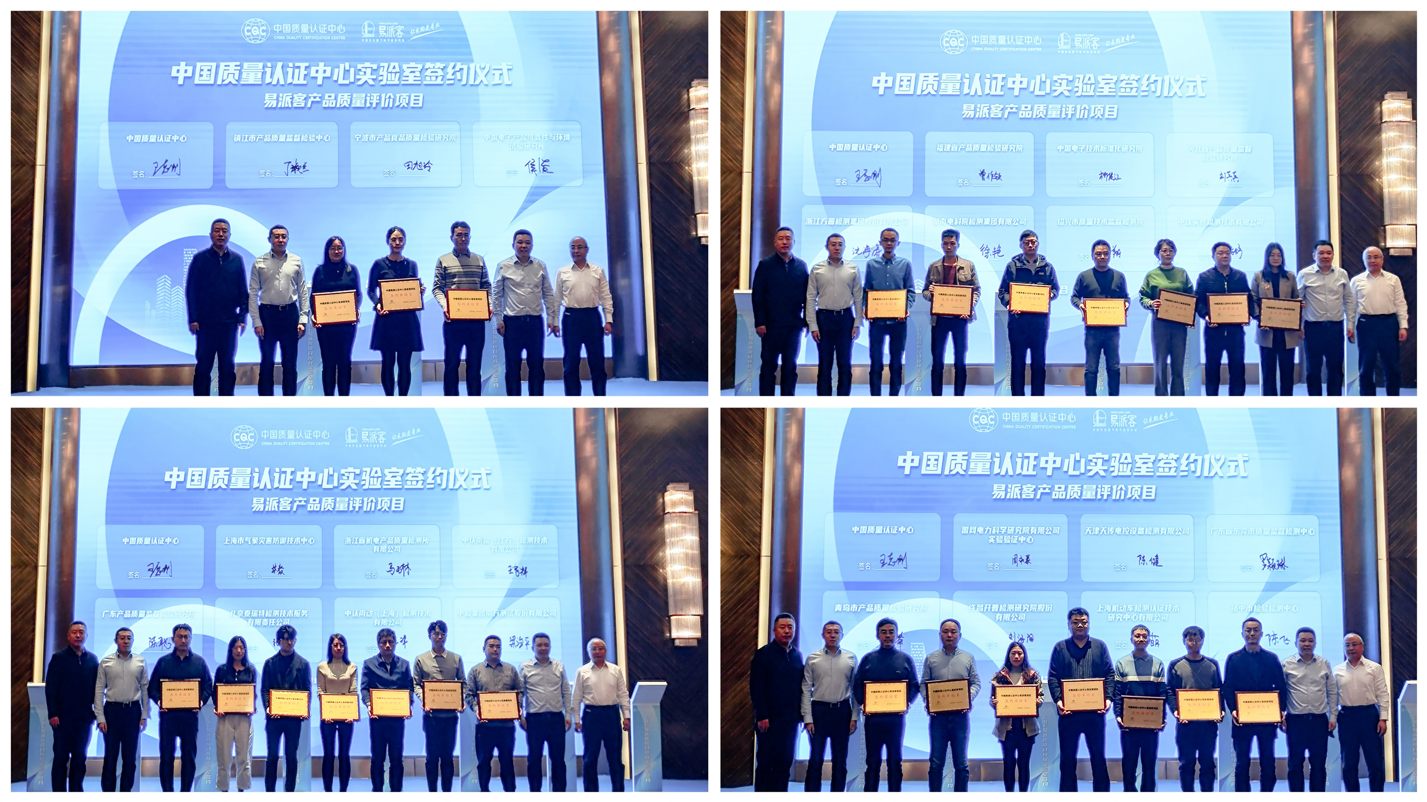 方啸天介绍了易派客开展产品质量评价的相关要求。中国质量认证中心市场部相关负责人对认证中心开展易派客项目整体情况及对实验室的管理要求进行了介绍。与会实验室代表就易派客项目检测业务情况展开交流分享。会上,中国质量认证中心还与34家委托实验室签署了《易派客产品质量评价检测技术服务合同》并为其授牌。