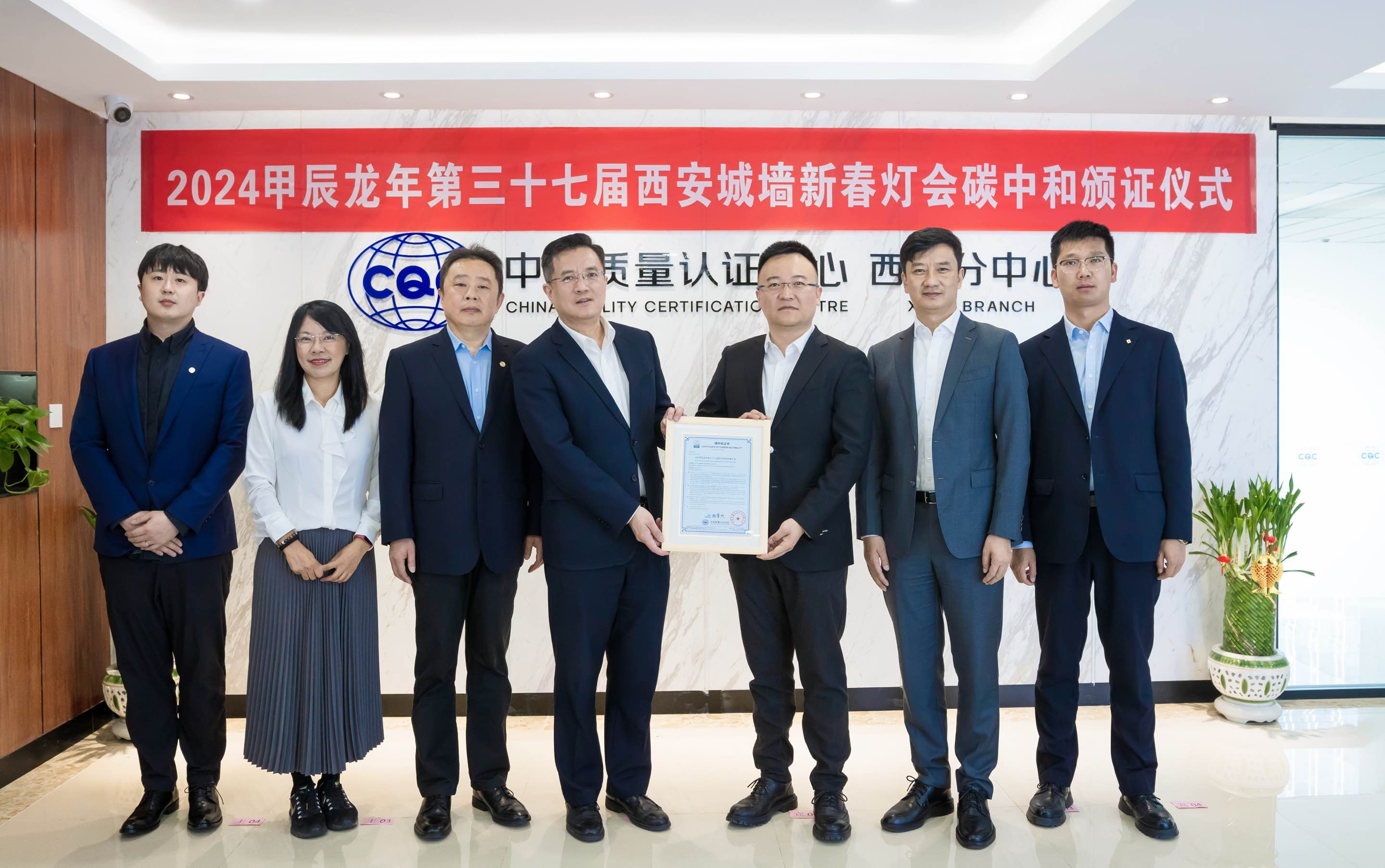 4月17日,中国质量认证中心在西安成功举办了2024甲辰龙年第三十七届西安城墙新春灯会(以下简称“新春灯会”)碳中和证书颁证仪式。来自西安城墙管理委员会、相关企业和媒体的代表参加了活动。