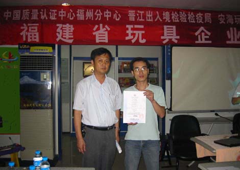 ![]() CQC福州分中心为晋江万代好玩具有限公司颁发玩具产品CQC标志认证证书 2005年8月4日,中国质量认证中心(CQC)福州分中心联合晋江出入境检验检疫局及安海玩具同业公会在泉州召开福建省玩具企业座谈会,来自36家企业的55位代表参加了会议。 会上,CQC福州分中心向到会企业代表详细介绍了玩具产品CQC标志认证相关内容及开展玩具产品认证的重要意义,并就福建玩具企业开展CQC标志认证工作的总体情况进行了简要的说明。会后,不少企业代表表示希望通过开展玩具产品CQC标志认证来提升玩具产品质量。 期间,CQC福州分中心还为福建省获证玩具企业-晋江万代好玩具有限公司进行了现场颁证。 |