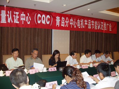 2009年9月9日,中国质量认证中心(英文缩写CQC)青岛分中心在青岛召开电机产品节能认证推广会。CQC产品四部、山东省产品质量监督检验研究院的相关人员和来自青岛、德州、烟台、威海四个地区的多家大型电机产品生产企业代表参加了会议。