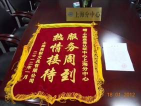 2012年1月17日,上海美毅文具有限公司为上海分中心赠送“热情接待 服务周到”锦旗一面,感谢上海分中心在对该企业3C玩具认证申请过程中热情的服务,帮助企业在较短的时间内获得认证,产品能够在春节前将投放市场。