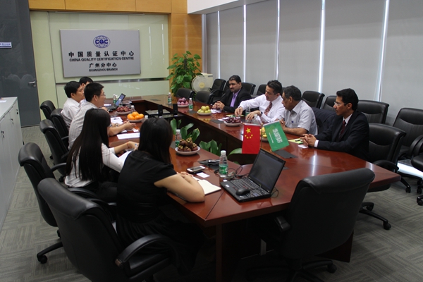 2014年10月1日,沙特标准、计量与质量局(SASO)副局长Mr Eng.Fwzi H.Hakeem及沙特海关Mr Mohammed S.Allathith等一行4人访问广州分中心。双方就中心开展的出口沙特认证业务进行了交流,并就双方下一步更深入的合作进行了探讨。 (广州分中心、国际业务部 供稿)