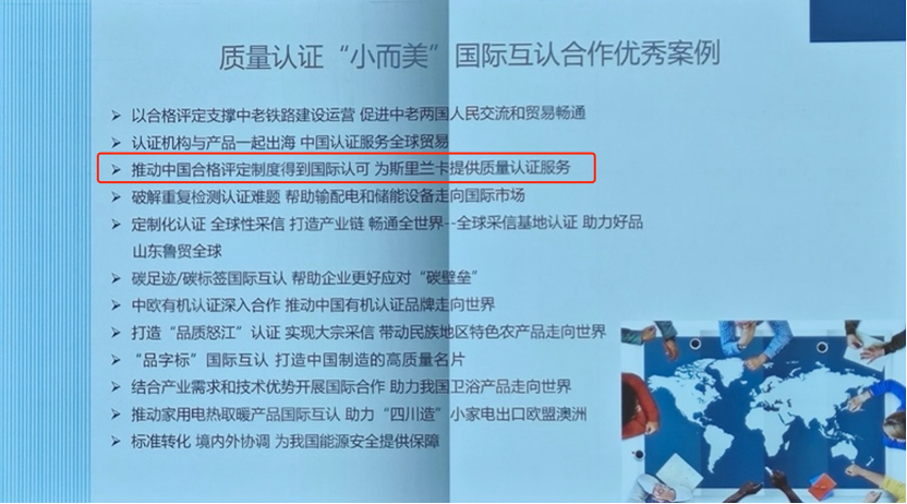 6月6日,国家市场监管总局(国家认监委)在河北雄安新区举办了2024世界认可日活动暨中国认证认可大会。活动期间,中国质量认证中心(CQC)报送的国际互认合作案例《推动中国合格评定制度得到国际认可 为斯里兰卡提供质量认证服务》荣获国家市场监管总局(国家认监委)质量认证“小而美”国际互认合作优秀案例称号并于专题活动中发布。这一案例展示了中国质量认证中心与斯里兰卡标准局合作的杰出成果,为促进中斯双边贸易便利化奠定了坚实的技术基础。