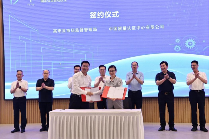 2025年5月21日,保定市市场监督管理局联合保定市发展和改革委员会、工业和信息化局、生态环境局等单位在保定市高阳县举办纺织品碳足迹标识认证国家试点建设启动仪式。中国质量认证中心受邀参加活动,并与保定市高阳县人民政府签署战略合作框架协议。