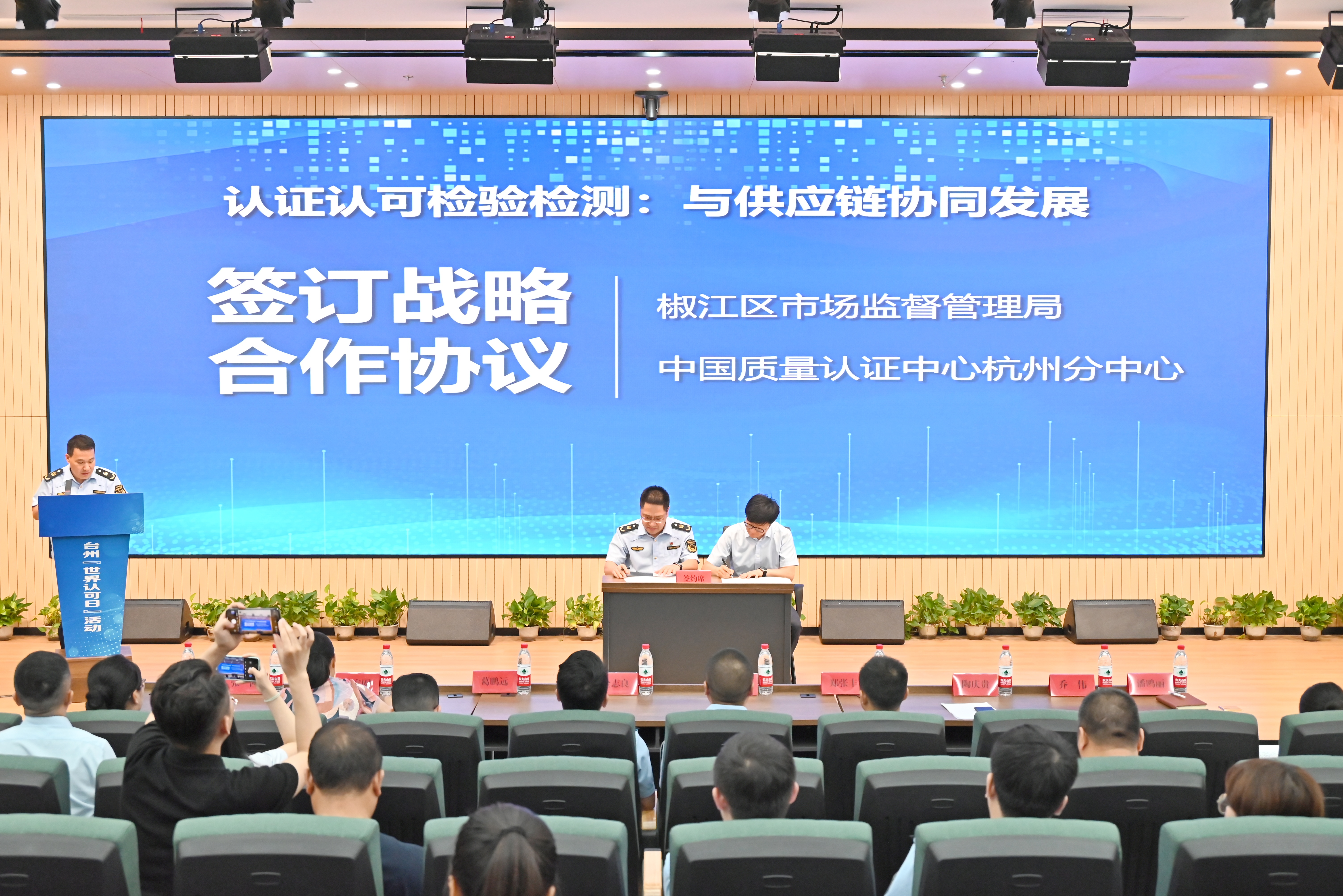 活动期间,杭州分中心还与椒江区市场监督管理局共同签署了质量管理体系分级认证试点工作合作协议。同时,围绕“供应链协同发展”的核心议题,杭州分中心代表作专题分享,阐述了认证认可检验检测在保障供应链韧性与安全、促进上下游质量协同、提升整体效率与信任中的重要作用。