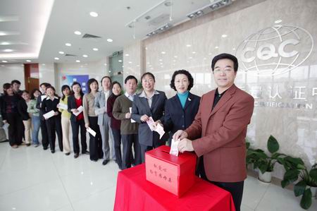 自国家质检总局计划生育委员会办公室发出了《关于开展“向实行计划生育的贫困母亲献爱心”募捐活动的通知》以来,CQC高度重视此项活动,李怀林主任要求广大党员带头,带动全体职工,把这次募捐活动作为实现三个代表重要思想,体现党员先进性的具体行动。车有高副主任要求新成立的工会女工委具体负责落实这项活动,在三天之内上交完成。