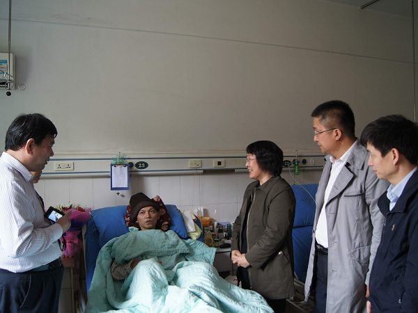 2012年4月10日,中心主任王克娇,工会副主席王永建一行专程看望患病住院的成都分中心职工、全国十大模范工厂检查员王启文同志,并带去了中心全体员工的慰问。
