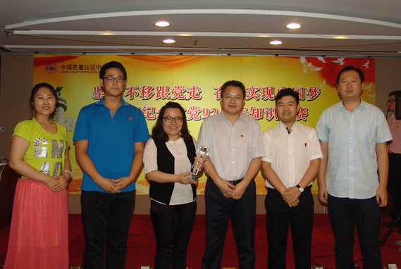 为迎接建党92周年,加强基层党组织建设,展现员工精神风貌,2013年6月25日至7月1日,中国质量认证中心举办主题为“坚定不移跟党走,奋力实现中国梦”知识竞赛活动。通过数轮激烈角逐,最终第二党支部代表队获得第一名,产品四部党支部位列第二,技术部党支部和国际部党支部获得优胜奖。