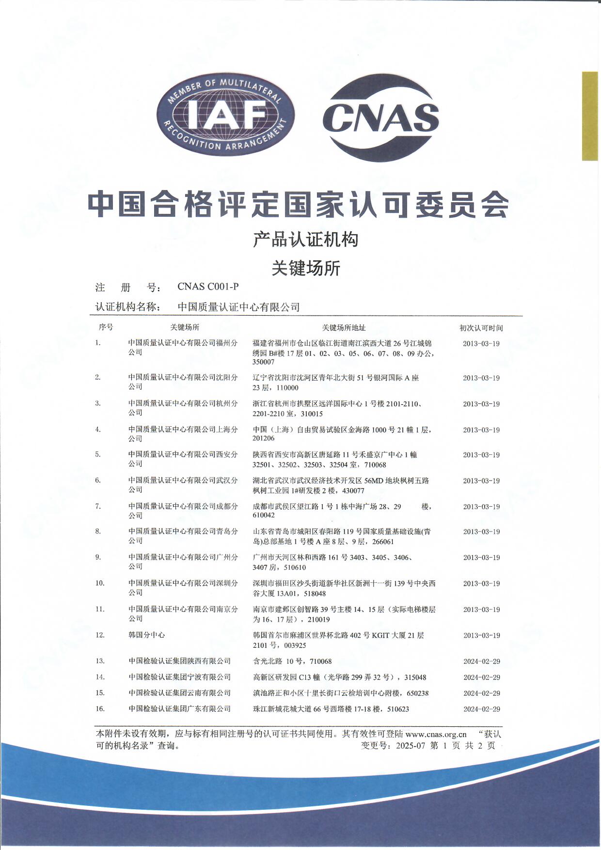 CNAS产品认证机构关键场所证书(中文)