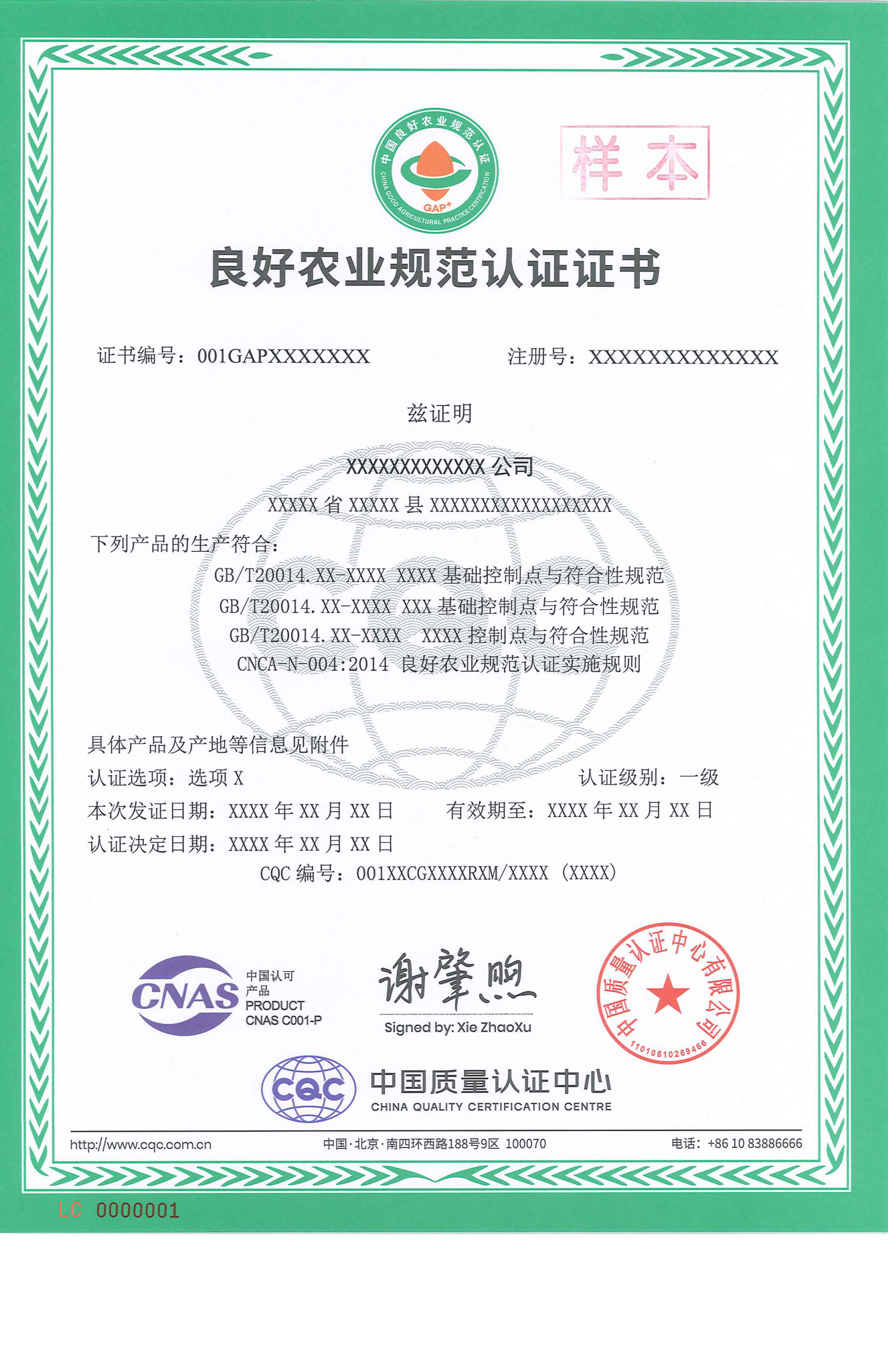 良好农业规范认证证书(GAP)一级GAP+(带标)