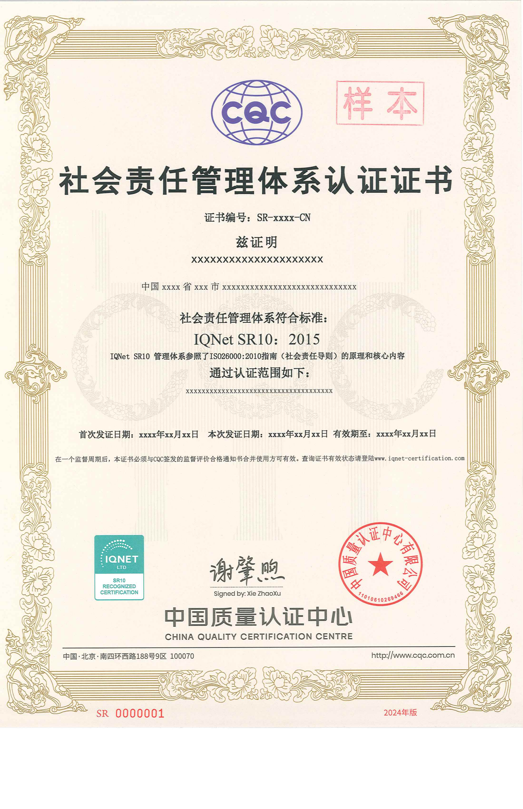 社会责任管理体系认证证书(SR10)