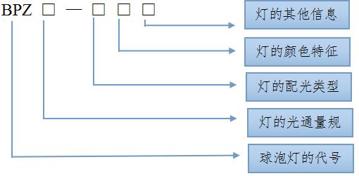 球泡灯的型号命名由五部分组成:第一部分BPZ是球泡灯的代号;第二部分是灯的光通量规格;第三部分是配光类型,有三种配光类型,全配光(代码为O)、准全配光(代码为Q)和半配光(代码为S,可省略);第四部分是灯的颜色特征,采用显色指数代码(8表示不低于80,9表示高显色指数)和色调代码组合表示;第五部分为补充部分,可以是灯头型号或其他信息。