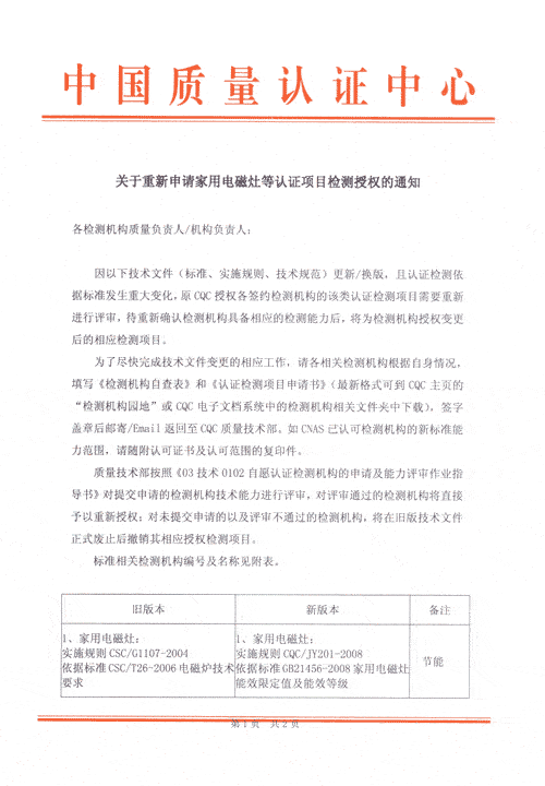 关于重新申请家用电磁灶等认证项目检测授权的通知