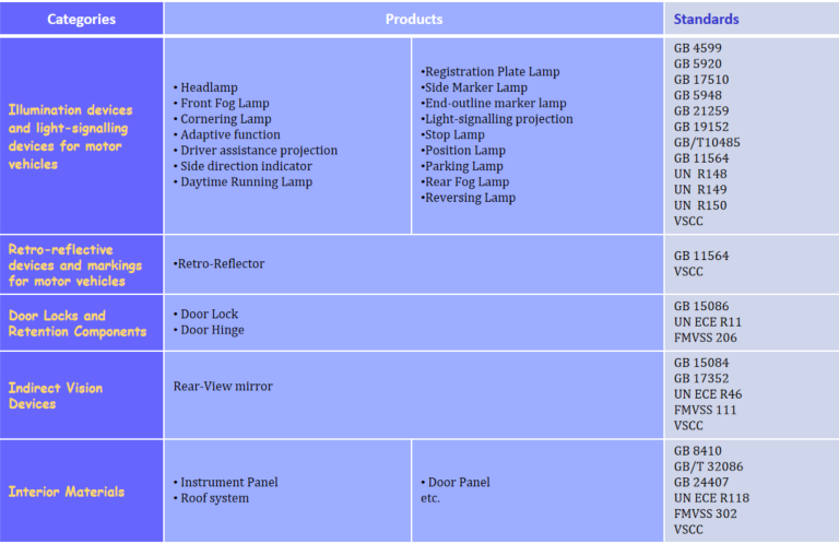 At present, the main business of the branch includes CCC, CQC, EU E-mark certification testing, American standard FMVSS testing, Taiwan VSCC Vehicle Safety Testing Regulation (VSTD) certification testing, Korean standard KMVSS testing, Indian standard AIS certification testing, non-metallic material testing, textile testing and other related certification testing and technical services. The specific scope of certification testing is as follows: