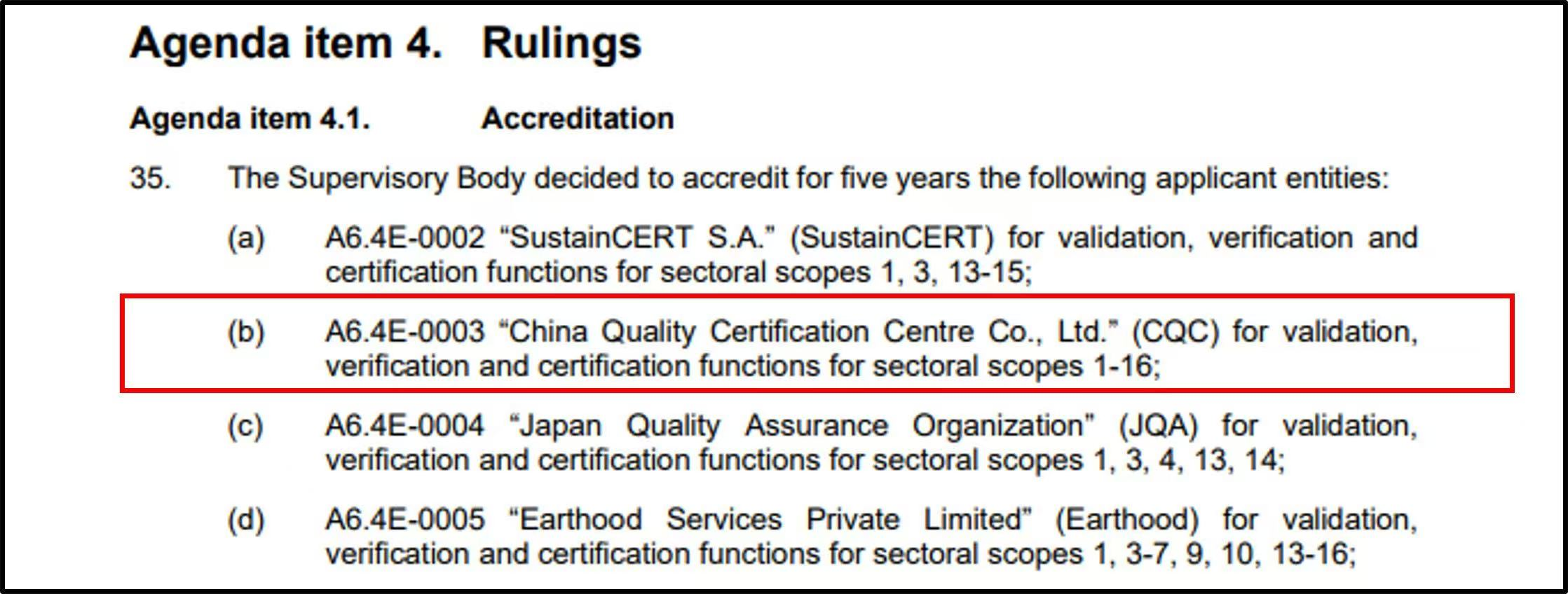 Moving forward, CQC will strictly adhere to the technical standards and management rules set by the Article 6.4 Supervisory Body. Upholding the principles of objectivity, impartiality, and independence, CQC will leverage its technical strengths and extensive experience in the validation and verification of greenhouse gas emission reduction projects to provide global clients with high-quality and efficient professional services. CQC is committed to actively contributing to the improvement of the global carbon market system and supporting the achievement of global climate goals.