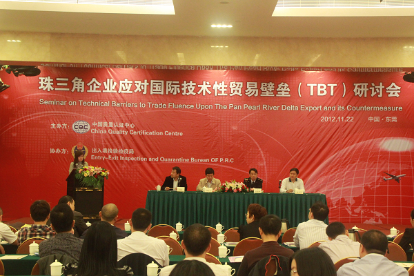近日,广州分中心在广东省东莞市举办珠三角企业应对国际技术性贸易壁垒(TBT)研讨会,国家认监委国际合作部副主任黄首云及东莞出入境检验检疫局相关领导参加会议,共有270余名电子电器、机械、玩具、家具、纺织服装等行业的出口企业代表参加。